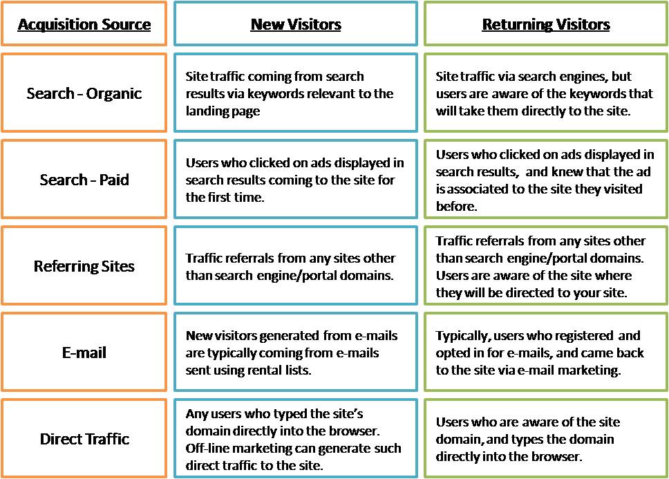 Traffic sources can be broken down into two types of visitors; new and returning visitors. It is important to segment your site traffic by the acquisition sources and see if those sources are driving new traffic or not.