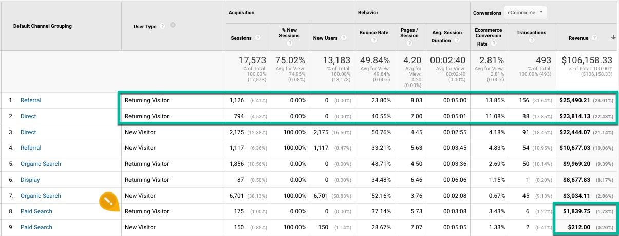 You’ll find an interesting result as returning visitors from Organic Sources (Referrals and Direct) make up a large revenue. That seems to be the case for Paid Search, as it reaches visitors who have been to the site before, hence converting on their subsequent visits.