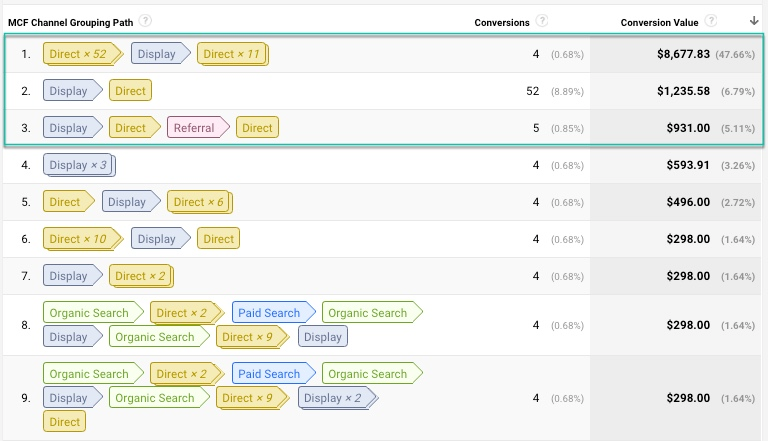 This is another powerful report to check. In this example, I searched for any path that includes ‘Display’ Ads as their path to conversion.
