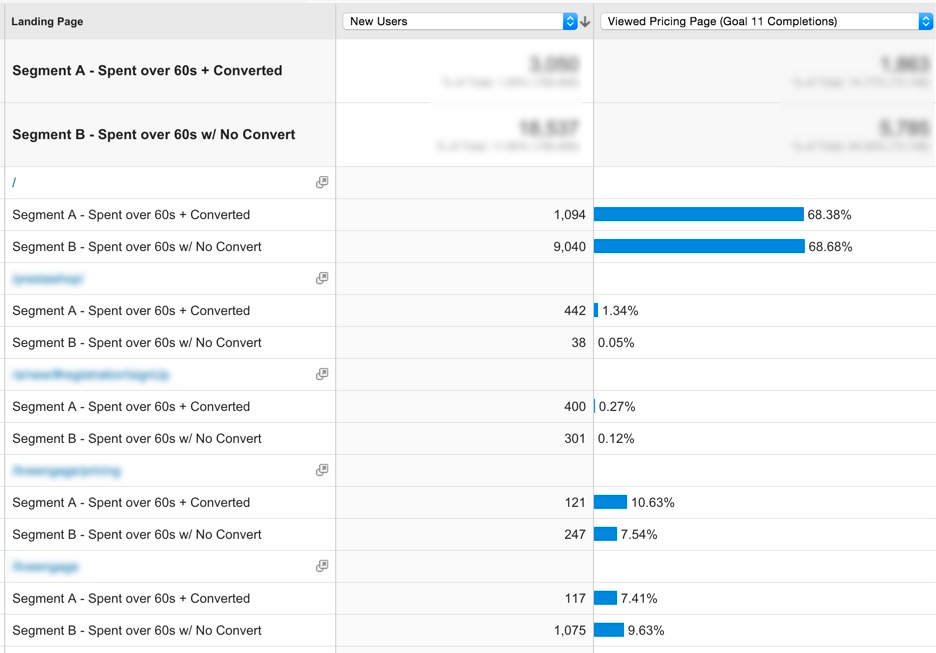 This image is a cut out of landing page segmented by people who spent over 60 sec and viewed pricing page Vs. didn’t view pricing page. You can see that the difference in new users count and % of traffic hitting the key page is quite different on certain pages. What does this difference mean? And what does this user behavior indicate? What would you do more to gain better insights and dig deeper?