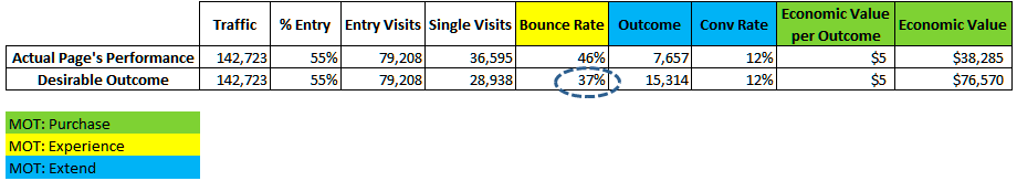 Let’s say a particular page is getting such traffic and relating results at bounce rate of 46%. Say the goal is to double the outcome by 2x, where you happen to know that economic value per traffic is at $5, yielding $76,570 in total value for current converting traffic of 142,723 visits.