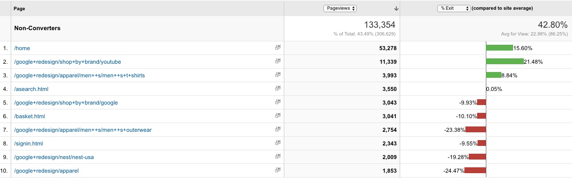 This is another great report to analyze. When you look at a traffic segment for those who did not buy anything on your site, which page are they viewing the most, and which courier has the highest exit rate.