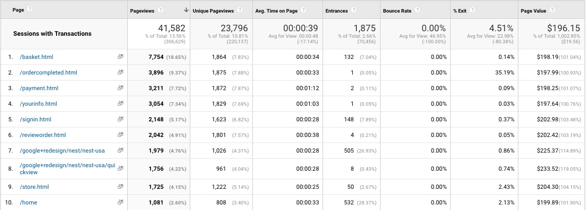 Another interesting point that you see in this report is that people are spending much time on /payment.html (1 min 12 sec), while most of the product page seems to have a time spent on a page at around 30 sec.
