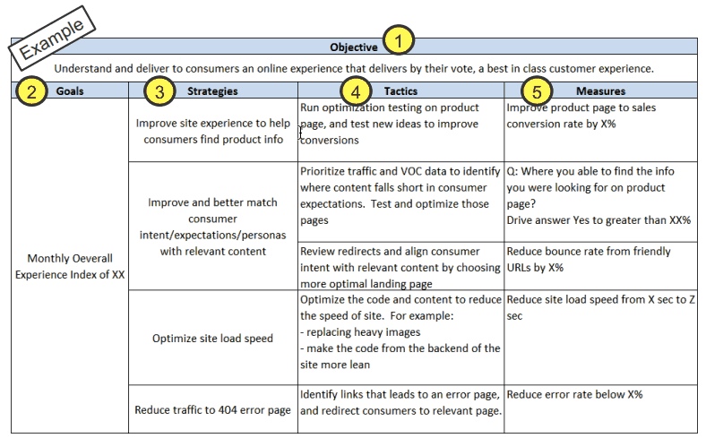 Ok, so if you check out this framework, you can start building your list according to the Goal you’d like to set, which will be your KPI. Not the operational measures that track the strategies and tactics.