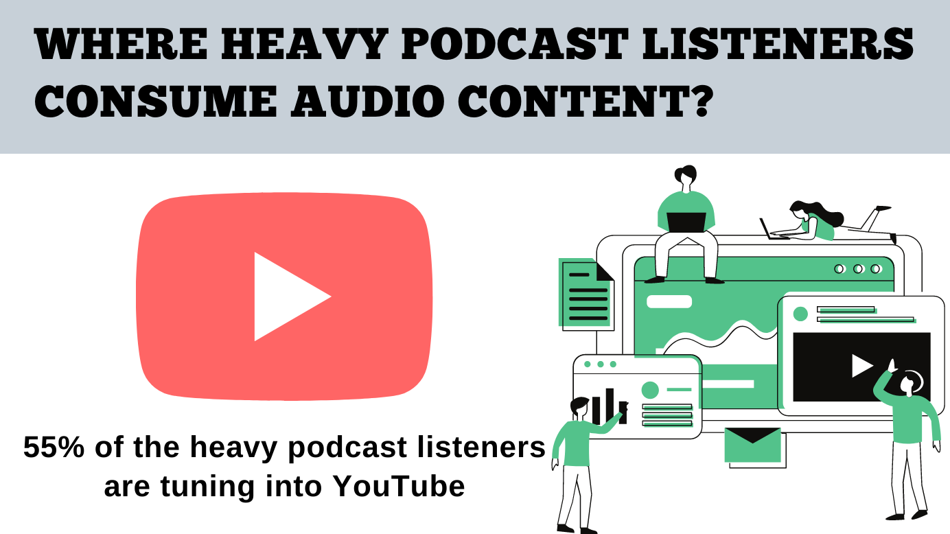 If you're one of the many Americans who listen to podcasts for more than five hours a week, you're likely podcasting on YouTube. The below data shows that – the leading podcast platform among heavy podcast listeners is YouTube, with 55% tuning there. In second and third