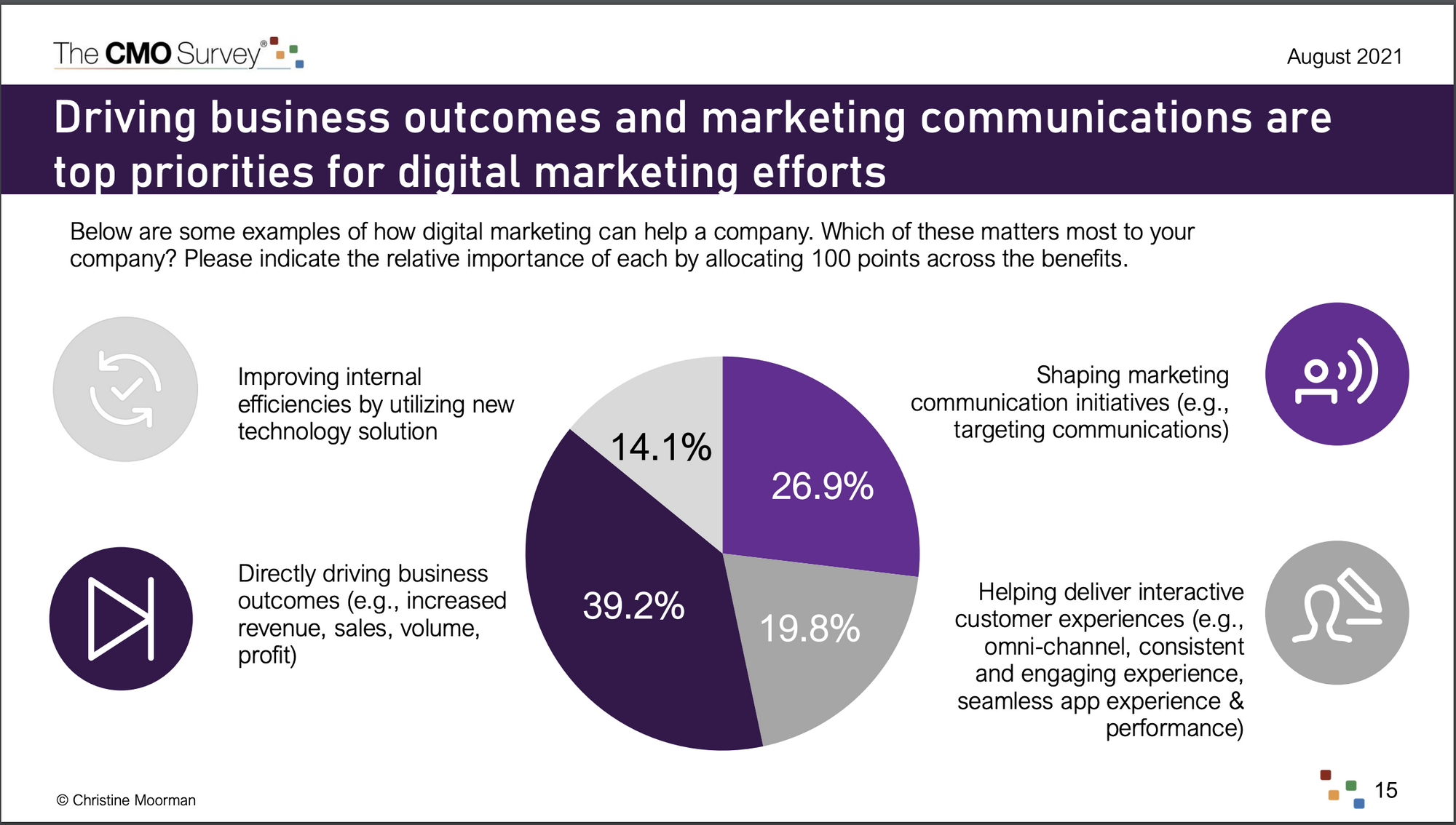 CMO's top priority is to drive business outcomes, like increased revenue, sales, profit, etc. 2nd priority is shaping marketing communication outcomes.