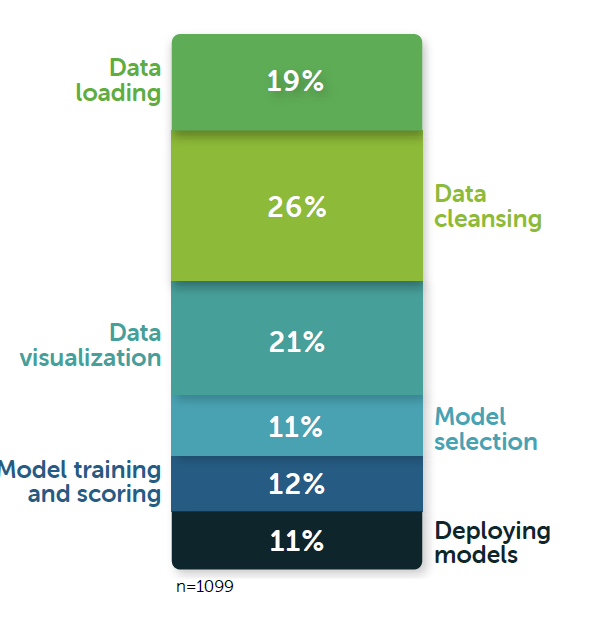 Data scientists or analysts spend 45% of their time getting data ready before using it to develop models and visualizations.