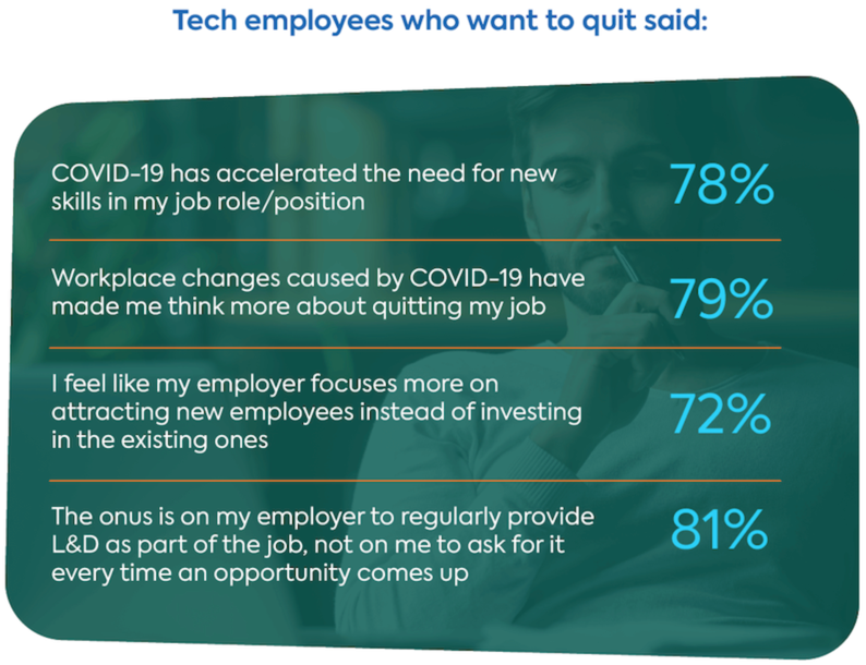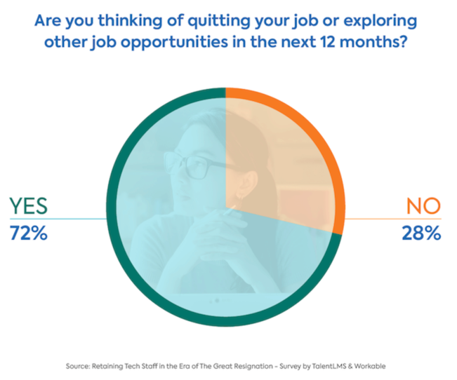 The new survey by TalentLMS and Workable showed that 72% of people working in tech/IT roles are thinking of quitting their jobs in the next 12 months. This is much higher than the 55% rate for the overall U.S. workforce.