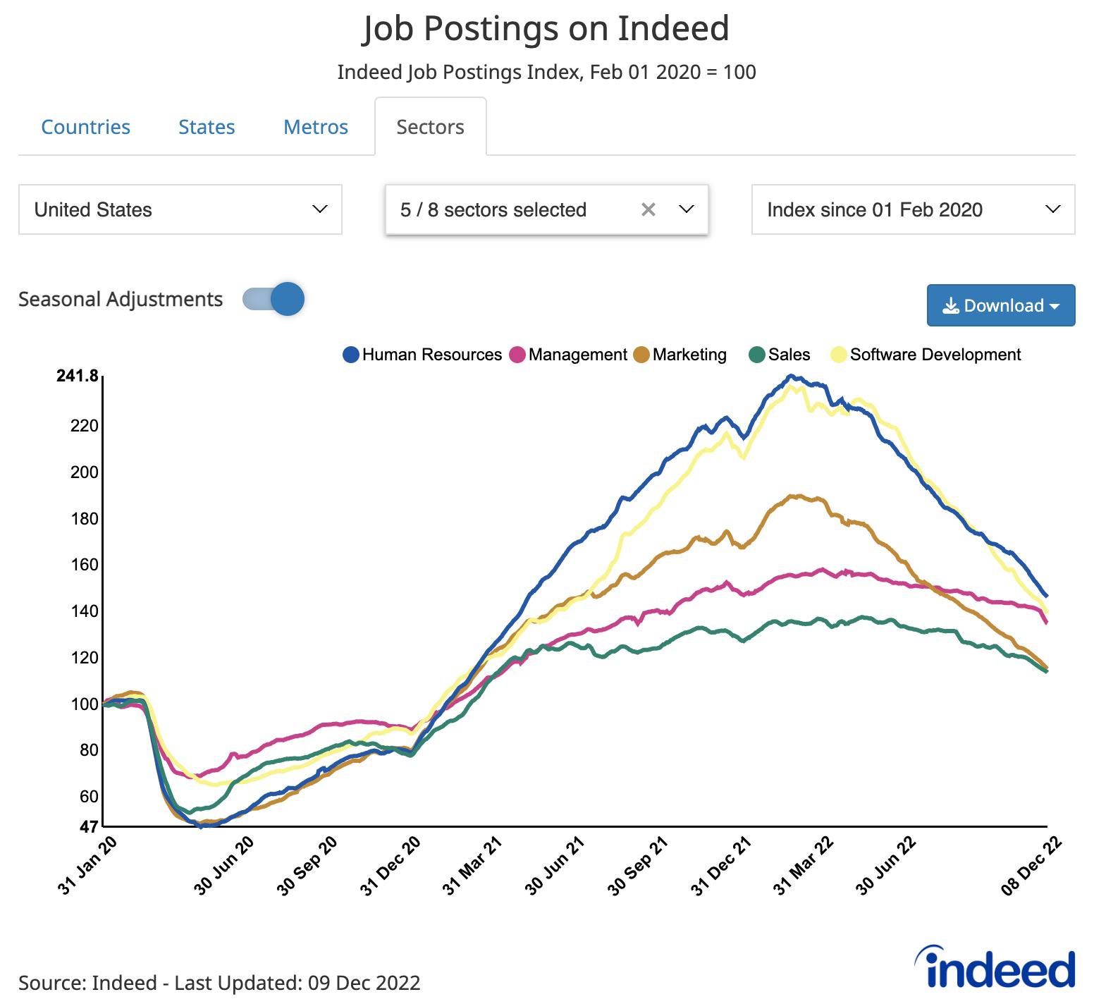 As you can see from the chart, the software development and human resources sectors are also in decline for job postings. So again, this indicates that companies are potentially cutting back on hiring for different roles across the board.