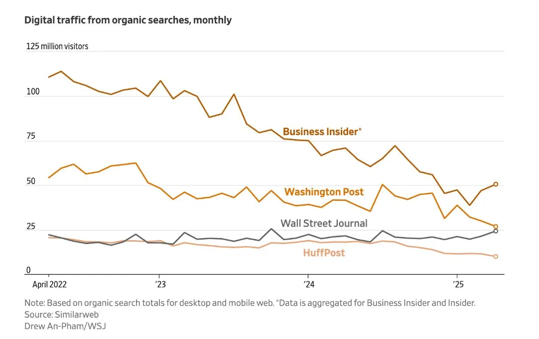This isn't a theoretical problem. I'm looking at industry reports right now showing that major online publishers and reference sites have seen devastating drops in organic traffic—some reporting declines of 20%, 30%, or even more since the widespread rollout of AI-powered answers. Top-of-funnel informational queries, the bread and butter of content marketing for years, are the most vulnerable. If a user can get a perfectly adequate summary of "how to change a tire" from the AI, why would they click through to a blog post?