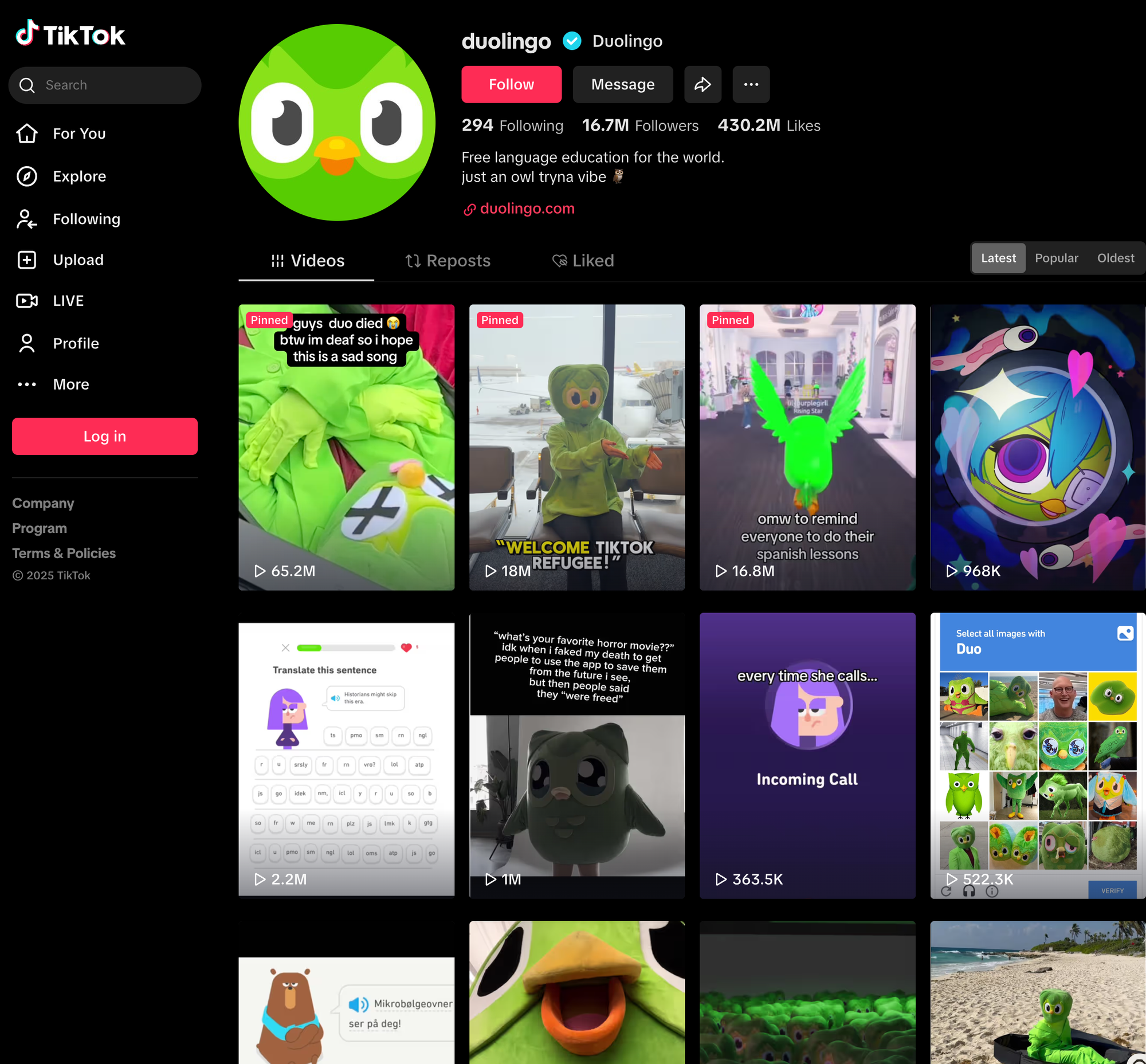 TikTok became Duolingo's playground for viral, short-form content. By hopping on trends and creating content with humor, they became a standout player on the platform. Viral videos regularly garnered millions of views, ultimately turning brand buzz into app downloads.