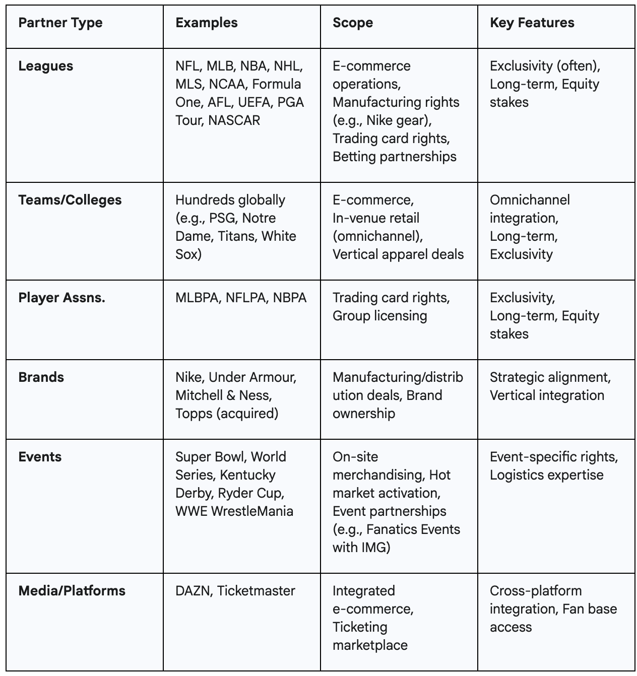 - Building Strong Partnerships: Collaborative ecosystems help Fanatics establish competitive advantages and deepen its market presence.