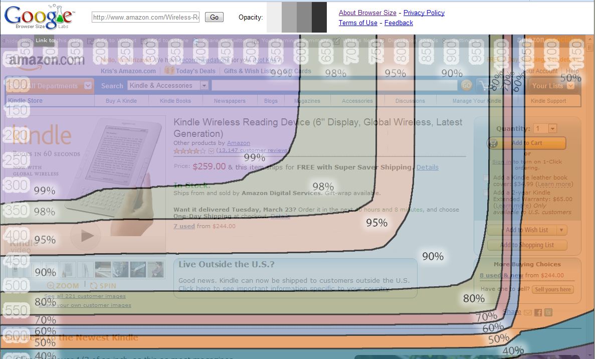 Taking this page as an example; hypothetically, let’s say the majority of Amazon’s visitors set their browser size to 950×500, that means, according to Google’s data, 90% of the Google’s visitors set their browser at least in this resolution.