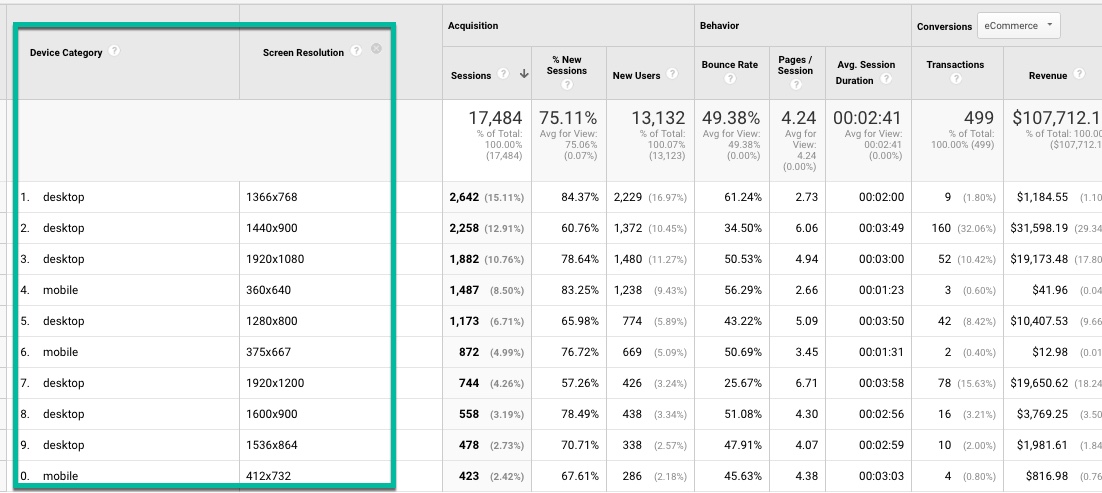Here is a custom report in Google Analytics that shows you the screen resolution per device type. It is very useful to see your performance measures and possibly find opportunities to optimize your site’s UX.
