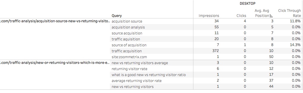 Here is an example of Google Search Console data I exported and analyzed through Tableau.