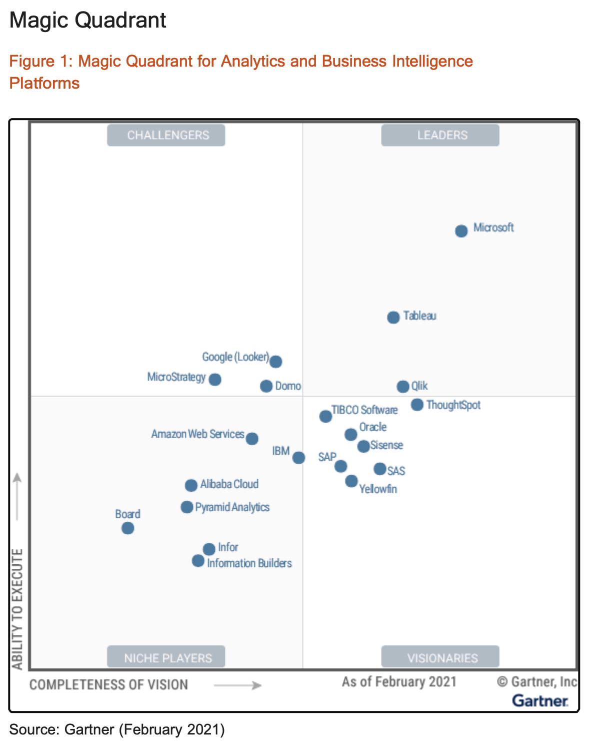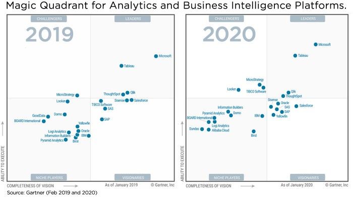 The Gartner's Magic Quadrant data in Feb 2021 showed Tableau in a leadership position, similar to Microsoft (Power BI).