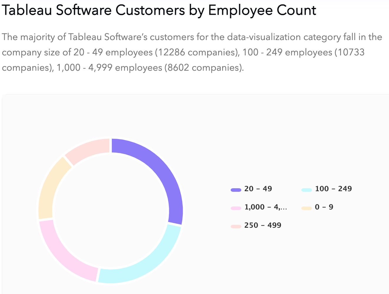 The majority of Tableau Software’s customers for the data-visualization category fall in the company size of 20 - 49 employees (12286 companies), 100 - 249 employees (10733 companies), and 1,000 - 4,999 employees (8602 companies).