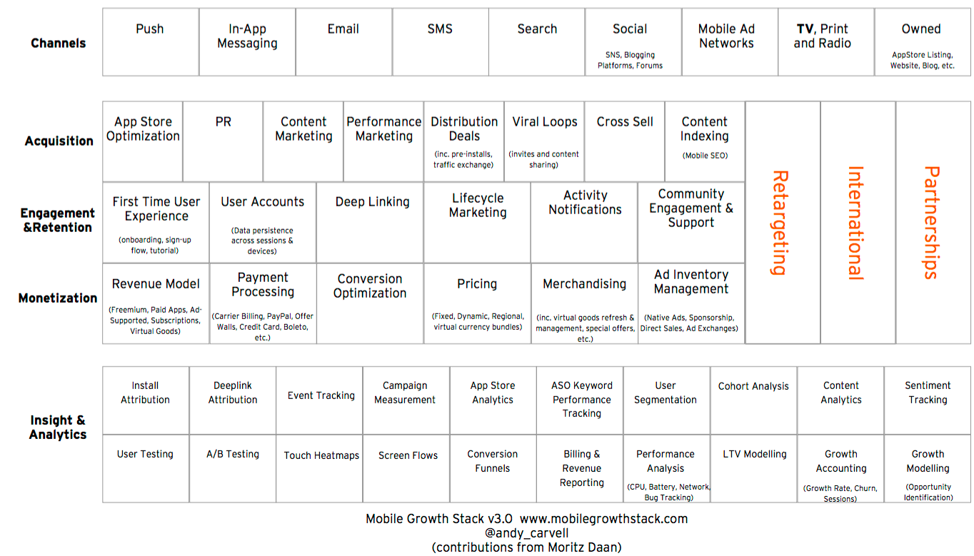 I really love this mobile analytics stack framework because it shows you different areas of marketing efforts, and how various marketing tactics and analytics stack co-exists in the marketing ecosystem.