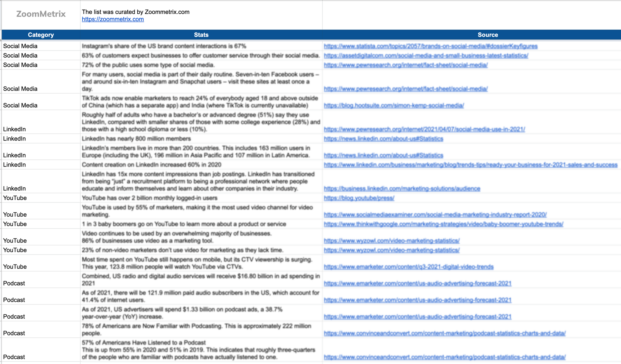 Download this free excel sheet with 103 curated stats that I believe are really great to know.